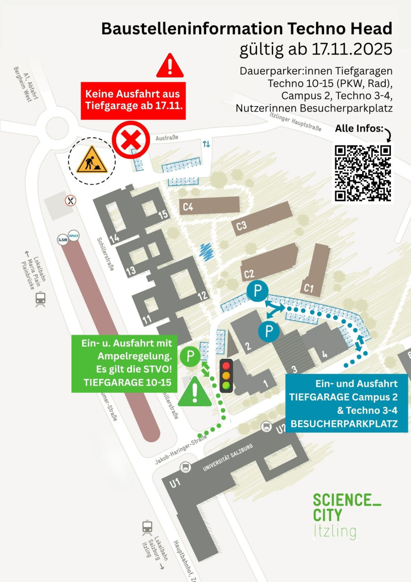 Ab 17. Nov. 2025 ist keine Ausfahrt aus der Tiefgarage in die Austraße möglich. Die Ausfahrt erfolgt über die Einfahrt (bis vss. Ende Februar 2026). Für ein reibungsloses Ein- und Ausfahren wird eine Ampelregelung mit entsprechender Bodenmarkierung eingerichtet. Ampel und STVO gelten sowohl für Auto- als auch für Radfahrer:innen, die in der Tiefgarage parken. - Dauerparker Campus 2 & Techno 3-4-CA1 / Einfahrt, Ausfahrt: