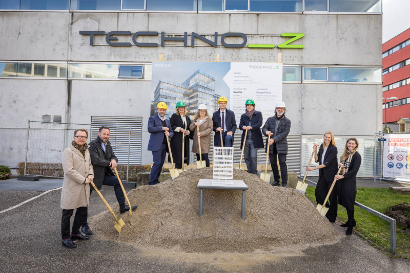 Vertreter:innen von Techno-Z Verbund, Raiffeisenverband Salzburg sowie Projektbeteiligte und zukünftige Mieter:innen schritten am 10.11.2025 zum gemeinsamen Spatenstich. Die tatkräftige Mitwirkung aller Beteiligten machte den gemeinsamen Baustart zu einem besonderen Ereignis.