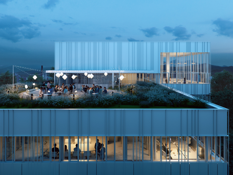 - Das eingeschossige 300m²-Office bietet repräsentative Räumlichkeiten in Toplage. Beide Einheiten verbinden moderne Architektur mit innovativem Raumkonzept, sind hochwertig mit Materialien wie Holz und Glas ausgestattet und bieten einen kurzen Weg zur Dachterrasse mit Dachgarten.